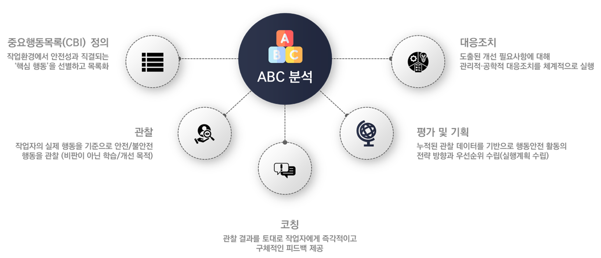 전 세계적으로 검증된 행동기반안전 프로세스(중요행동목록 도출 - 관찰 – 피드백 – ABC분석법을 통한 데이터 분석–장애요인 제거–지속적 개선)의 순환 구조를 통해 안전문화와 성과를 동시에 향상